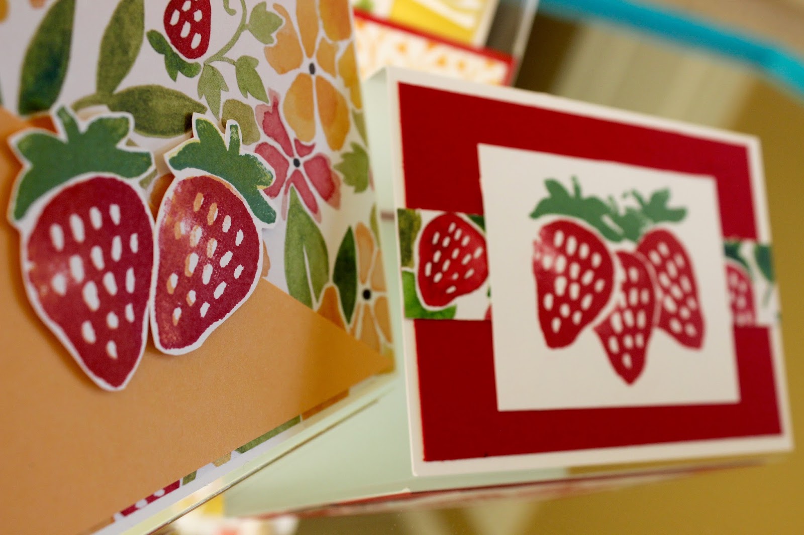 I am in LOVE with this stamp set from the new 2016 Stampin’ Up! catalog. I love the new Fruit Stand Suite – Fresh Fruit & Flowers. I created the same set of cards yesterday with Peaches. Today is the Pears, a few strawberries and Lemons. I am always in need of thank you gifts or cards. I have a treat bag with a set of 5 blank cards and topped off with a thank you tag. I loved making this so much, Next I am creating something with the Strawberry stamp.