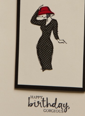 - Using archival black ink to stamp your lady on your 2-1/2″ x 3″ piece of very vanilla cardstock.