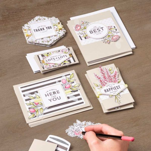 There’s lots to love in this Stampin’ Up! All-Inclusive Card Kit Lots Of Happy. Create all-occasion cards, then add your own color using the included Watercolor Pencils.