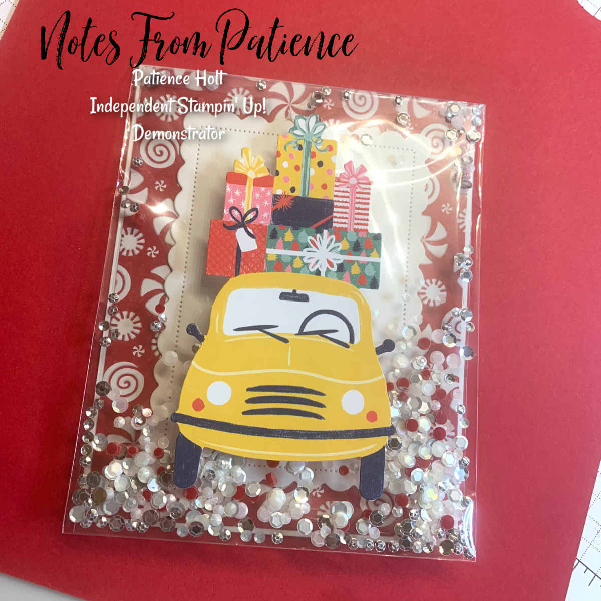 These shaker cards feature tags from the Love, Santa Tag Kit, Stampin’ Up! clear envelopes filled with sequins and a piece of Window sheet!. I go the idea from Patty Bennett who also gives credit to Ilda Dias. Such a creative way to make a different card.