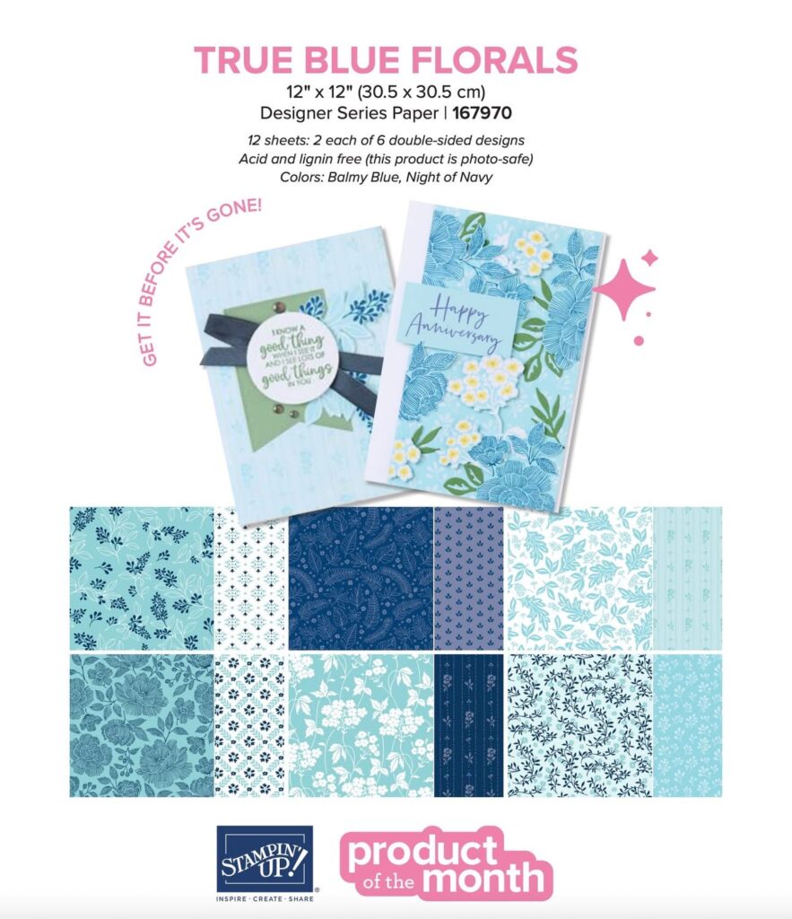 What is POTM, you ask? It is Product of the Month! Stampin’ Up! just unveiled their new Product of the Month promotion and it is beautiful True Blue Florals Designer Series paper.