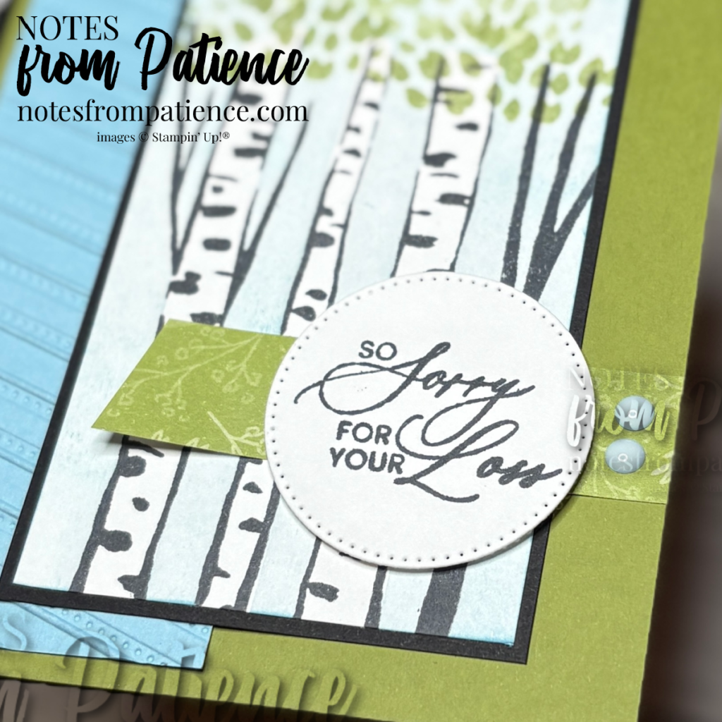 Hello there. From time to time, we all need a card to convey our condolences when there is a loss of a loved one, acquaintance and even a four-legged family member. This card is simple and beautiful. Just a small snippet of a woodland scene with the Aspen Grove Stamp Set. I masked off the tree trunks and and lightly brushed Balmy Blue on the my stamping surface. Love the results. This stamp set boasts a single tree or build a whole grove, layering different colors for a fun, natural look. Place several stamps on one block before inking to bring your forest to life in just one step!
