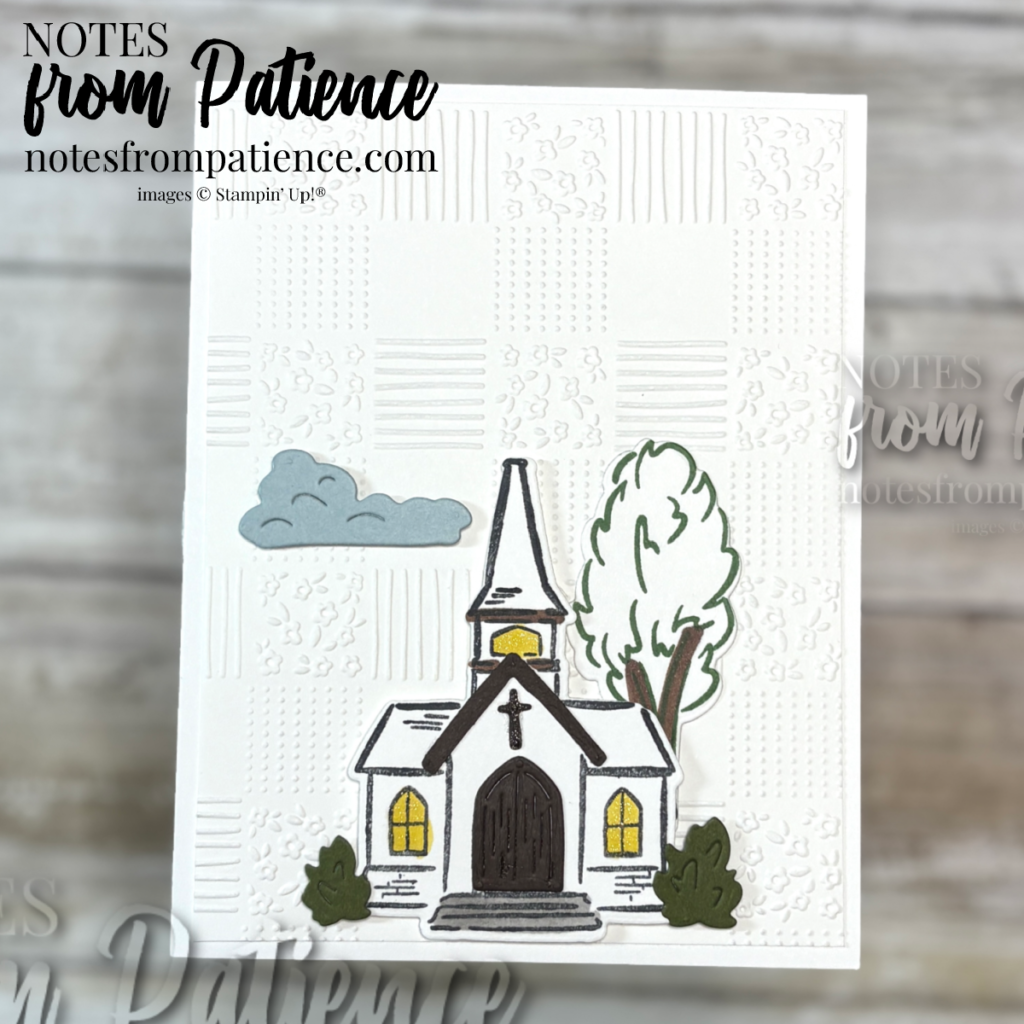 - Cloud Cover card stock was used for the cloud and Mossy Meadow card stock used for the bushes on each side of the church.