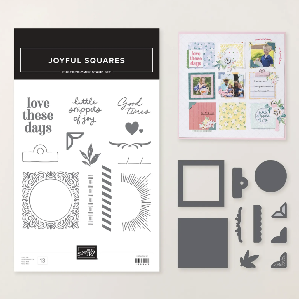 Celebrate cherished moments with the Joyful Squares Bundle. This bundle combines stamps and dies to craft personalized photo corners, radiant sunbursts, and heartfelt shapes. Design custom frames, striking card borders, and delightful accents for cards, tags, and memory-keeping projects. Add a touch of handmade joy to every creation and highlight life’s most special occasions.