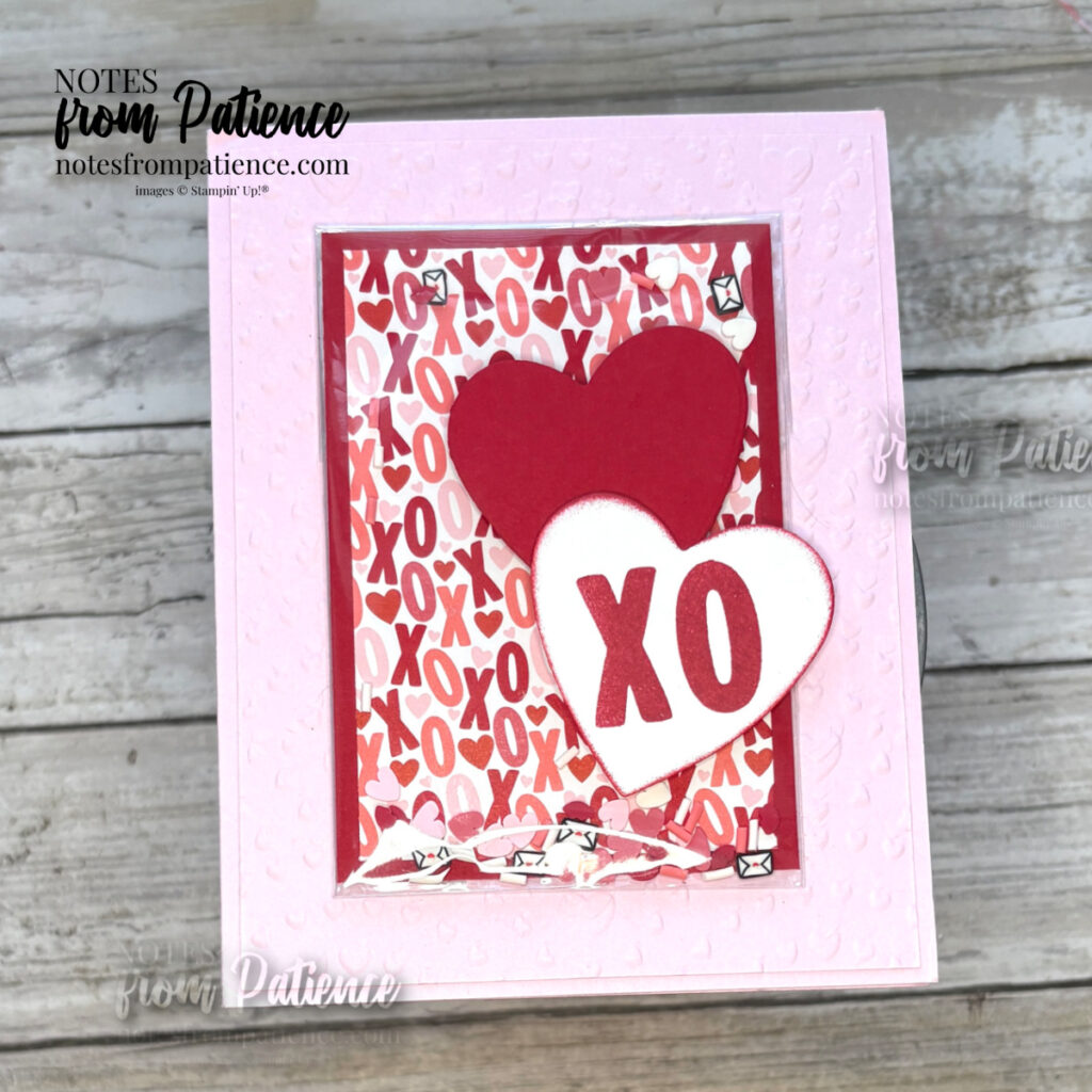 This is a card made by my team mate Susan Erickson of Little Rock Arkansas. She made a shaker card! Love the attention to detail using an embossing folder as well as Loose Valentine’s Assortment! Fabulousness happening here!