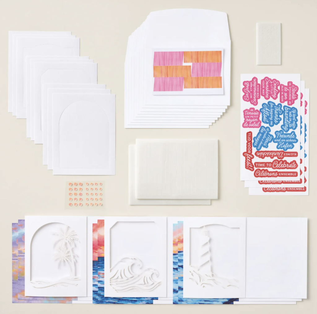 Kits Collection? The Stampin’ Up! Kits Collection is a line of all-inclusive, project-based crafting kits for ALL skill levels, featuring pre-cut, pre-printed supplies, adhesvice and instructions. Ranging from $10-$30, these kits focus on creating cards, tags, and home decor, with new options added regularly. Unlike Paper Pumpkin, these are individual purchases, not subscriptions.