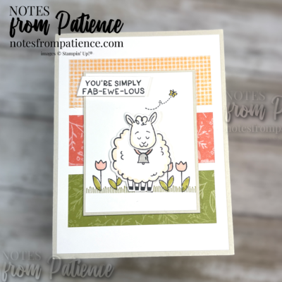 Welcome. If you have been following me, you know that one of my favorites words is FABULOUS! So when this stamp set appears in the Jan-Apr Mini Catalog - I of course purchased it! Check out page 51 in the catalog. LOVE! This card was a labor of love and I love how it turned out. Measurements ... Read More about Stampin’ Up Fab-Ewe-Lous